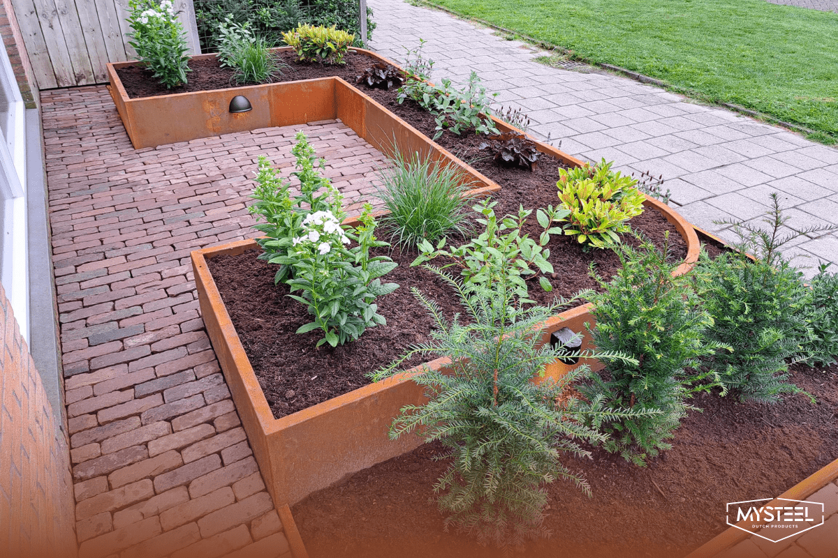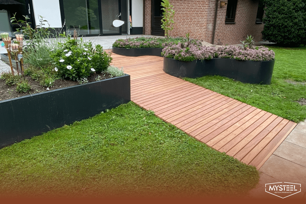 Se o seu jardim tem diferenças de altura, você pode criar terraços elevados. Use paredes de contenção de aço para suportar esses terraços e acomodar a diferença de altura.