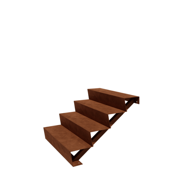 Material Essas escadas são fabricadas a partir de chapa de aço Corten-A de alta qualidade. Este tipo de metal tem como característica única a formação de uma camada de óxido (camada de ferrugem) muito densa. A corrosão total é, portanto, impossível. Devido à camada de óxido densa, o material subjacente é protegido do oxigênio, o que retarda fortemente a oxidação, enquanto a corrosão continua. A escada de aço corten é fornecida sem ferrugem, na cor metálica cinza. O início do processo de ferrugem começa nos primeiros 2 meses, não sendo necessário nenhum tratamento para isso. Durante o processo de ferrugem, a escada pode soltar resíduos. O aço corten é uma liga metálica que consiste em ferro, ao qual foram adicionados cobre, fósforo, silício, níquel e cromo.