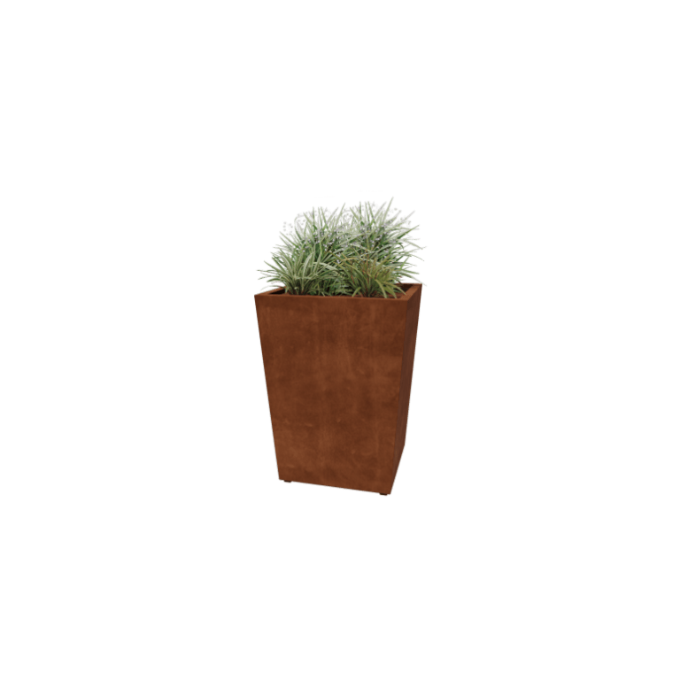 A floreira é feita de aço corten de alta qualidade. O processo de oxidação começa em algumas semanas a meses, formando uma cor visível quente entre o laranja e o marrom. Pode levar de 1 a 2 anos para que o processo de oxidação se complete. É possível acelerar este processo usando o acelerador de ferrugem MySteel. A camada de ferrugem protege o material contra corrosão adicional e confere uma aparência robusta.