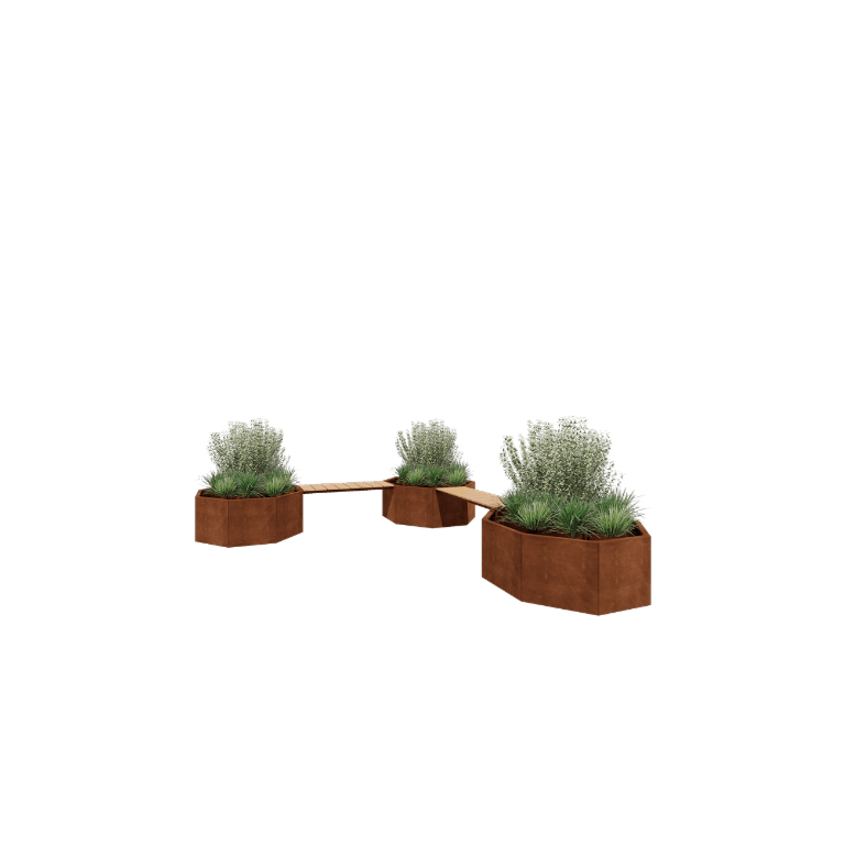 Floreira em aço corten - Octógone - Configuração em canto - 362,6 x 120,7 x 50 cm - Com banco - Sem placa de base