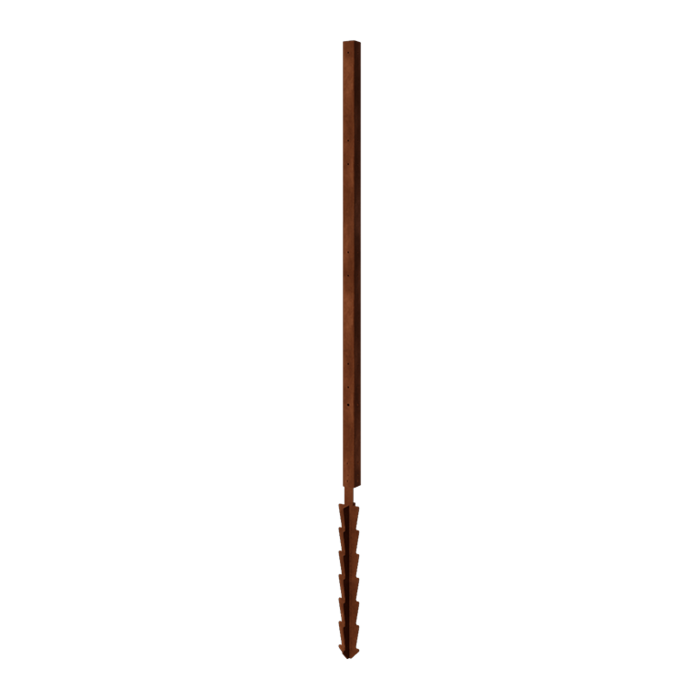 O suporte e o pino de solo são feitos de aço Corten-A de alta qualidade, uma liga metálica composta de ferro, cobre, fósforo, silício, níquel e cromo. A característica única do aço corten é a formação de uma densa camada de óxido, que atua como uma camada protetora contra a ferrugem. Esta camada evita a corrosão e protege o material interno contra oxidação adicional, enquanto o processo de corrosão continua lentamente.